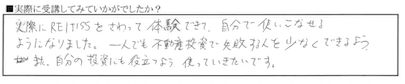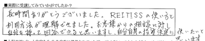 実際にREITISSを触って体験できて、自分で使いこなせる様になりました。一人でも不動産投資で失敗する人を少なくできるよう、また自分の投資にも役立つよう使っていきたいです。