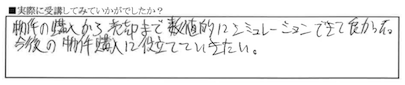 お客様にとって非常に分かりやすく説明できるシステムだと思います。変更によってシュミレーションをするにあたっては、どこをどう触ればどうなるかを分かっていないと反対にお客様を不安がらせると思いました。ポイントを抑えるため勉強します。