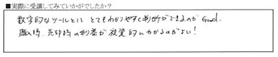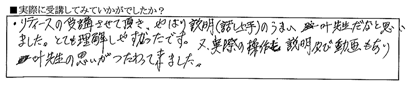 リーティスの受講をさせて頂き、やはり説明(話し上手)のうまい叶先生だなと思いました。とても理解しやすかったです。又、実際の操作も説明及び動画もあり叶先生の思いがつたわって来ました。