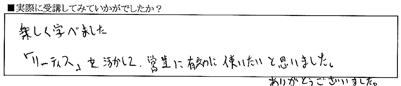 楽しく学べました。「リーティス」を活かして、営業に有効に使いたいと思いました。ありがとうございました。