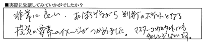 非常に良い。おぼろげながら判断のポイントとなる投資の要素のイメージ画つかめました。マスターコンサルタントにもチャレンジしたいです。